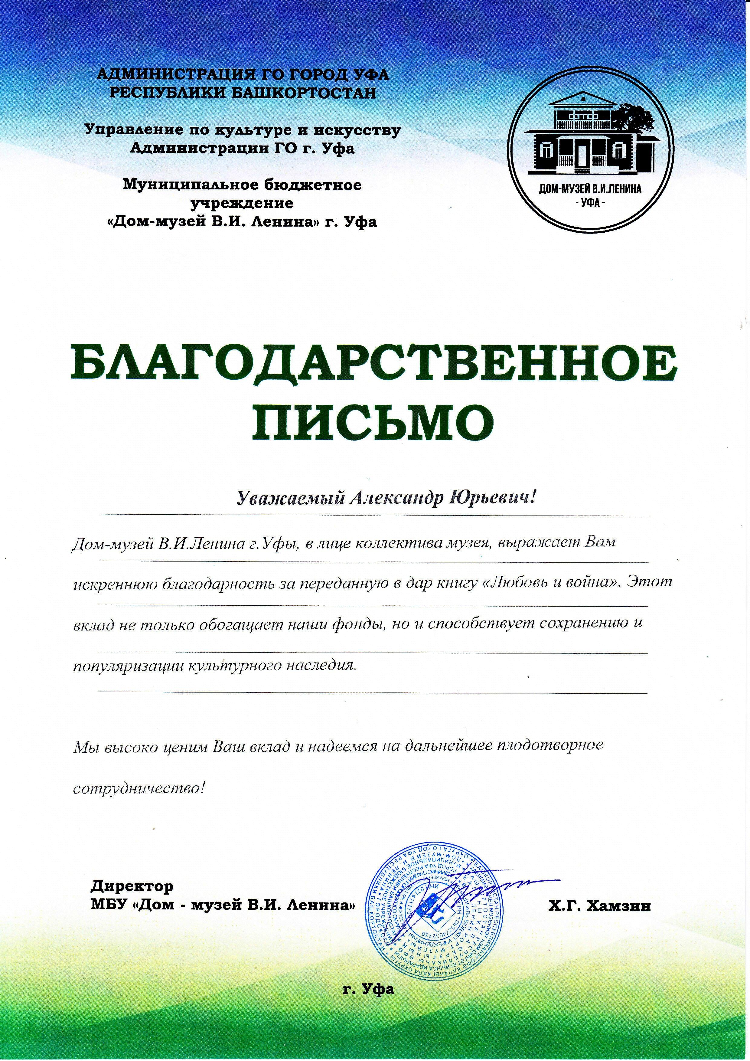 Благодарственное письмо от дом-музея имени В. И. Ленина